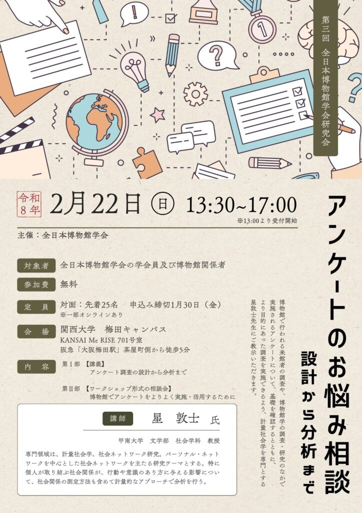 全日本博物館学会では、2026年2月22日(日)13:30〜17:00の日程で、研究会「アンケートのお悩み相談〜設計から分析まで」を開催いたします。博物館で行われる来館者の調査や、博物館学の調査・研究のなかで実施されるアンケートについて、基礎を確認するとともに、より目的にあった調査を実施できるよう、計量社会学を専門とする星敦士先生にご教示いただきます。