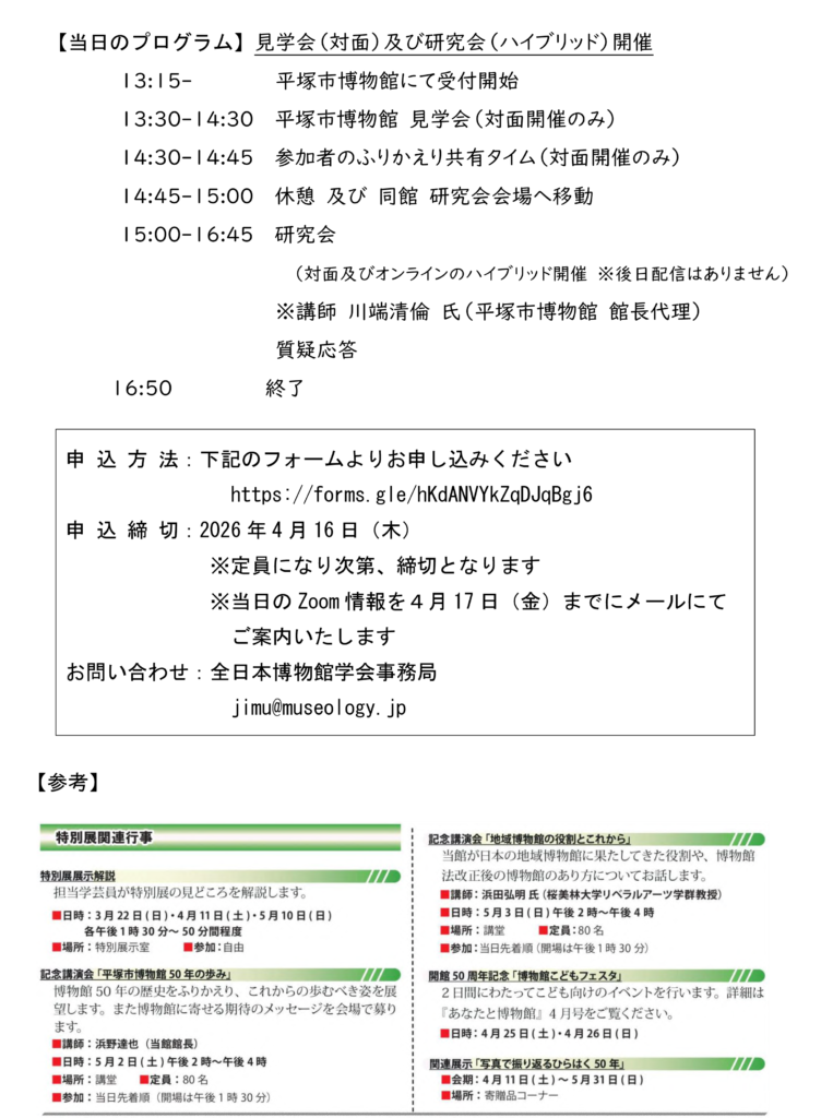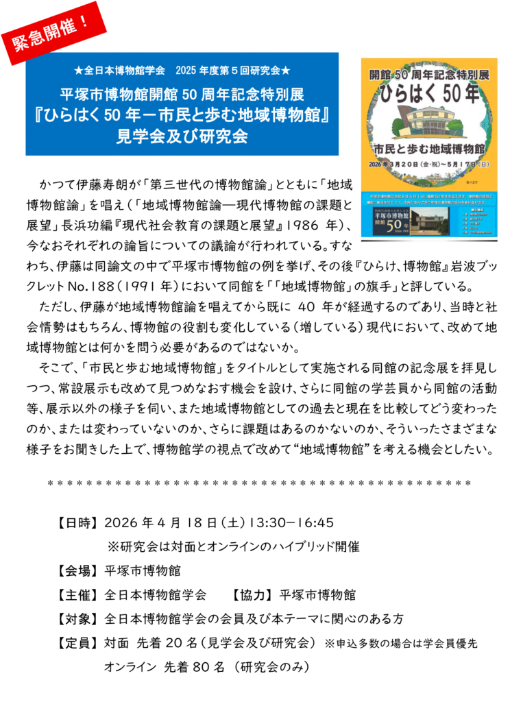 全日本博物館学会では、2026年4月18日(土)13時30分より、第5回研究会「平塚市博物館開館50周年記念特別展『ひらはく50年ー市民と歩む地域博物館』見学会及び研究会」を開催いたします。